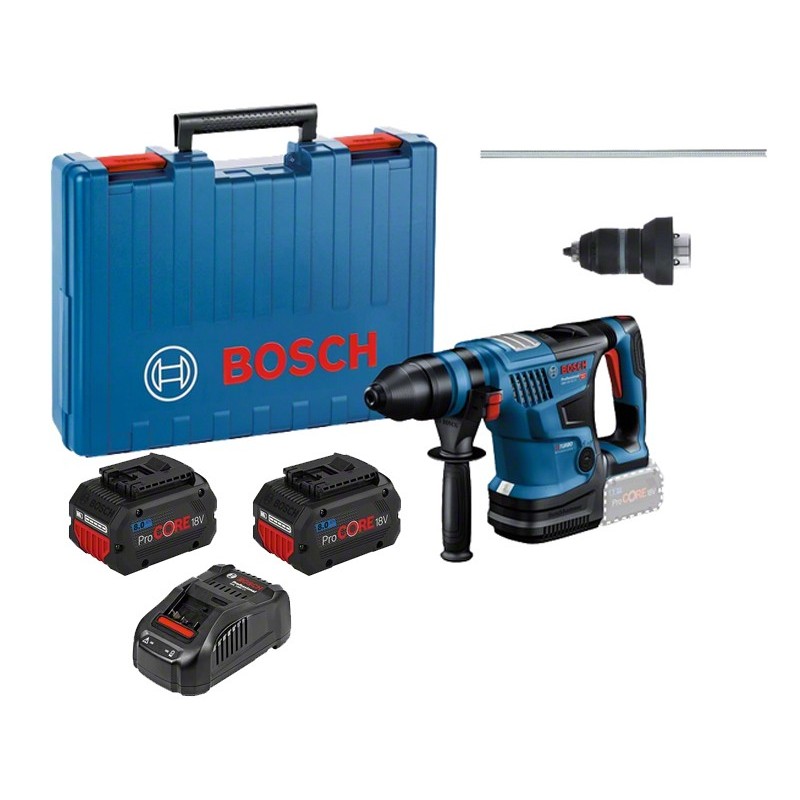 • Dotazione tipica: 2 × batterie ProCORE18V 8,0 Ah, caricabatterie rapido GAL 1880 CV, modulo Bluetooth GCY 42, mandrini SDS e autoserrante, impugnatura supplementare, limitatore di profondità, valigetta.