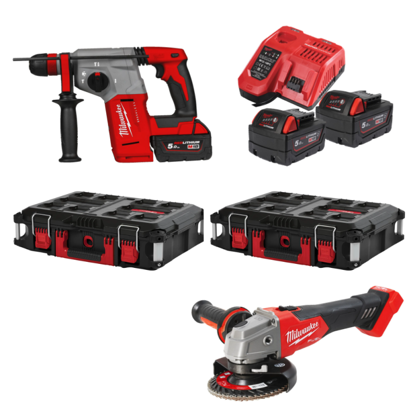 Kit 2 Utensili 18V Milwaukee M18 PP2-502 con Tassellatore BLHX + Smerigliatrice FSAG125X + 2 Batterie  5.0 Ah + Caricabatterie e Valigette cod. 4933498581