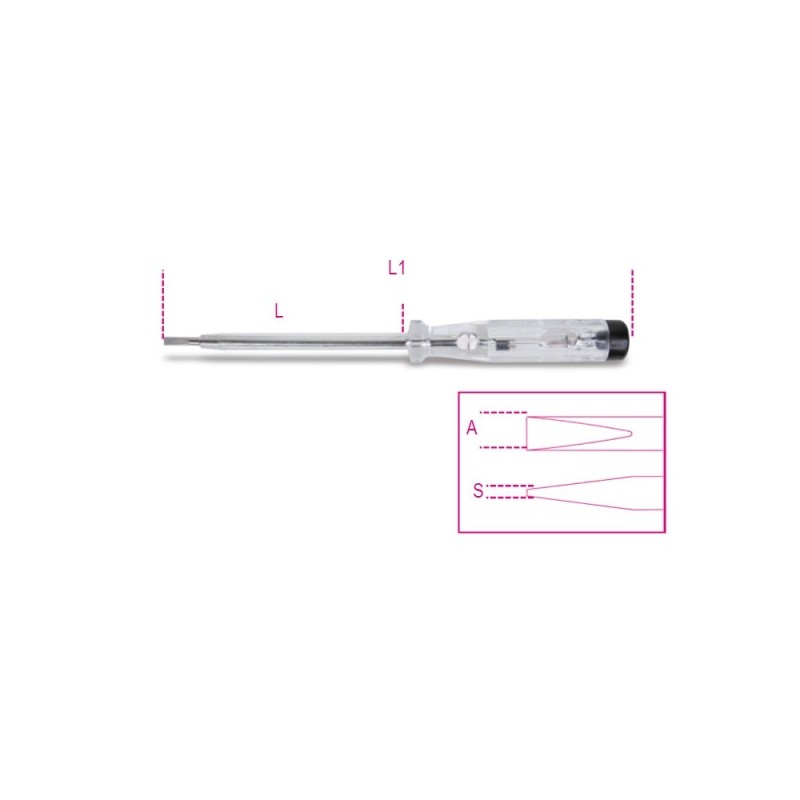 Cercafase (provacircuito) professionale Beta per l'individuazione rapida del conduttore di fase negli impianti elettrici. Corpo isolato con punta di contatto e indicatore luminoso. Strumento essenziale per elettricisti e manutentori.