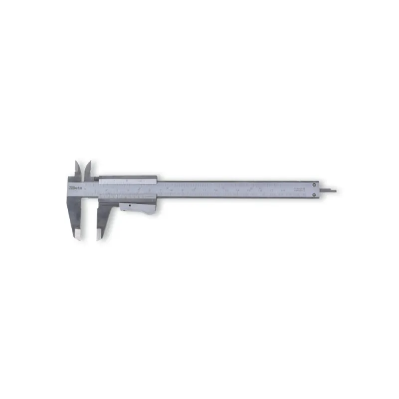 Calibro a corsoio professionale Beta per la misurazione precisa di dimensioni interne, esterne e profondità. Corpo in acciaio inossidabile rettificato con scala graduata ad alta leggibilità. Cursore con fermo di bloccaggio per fissare la misura. Disponibile in versione analogica ventesimale o digitale con display LCD.