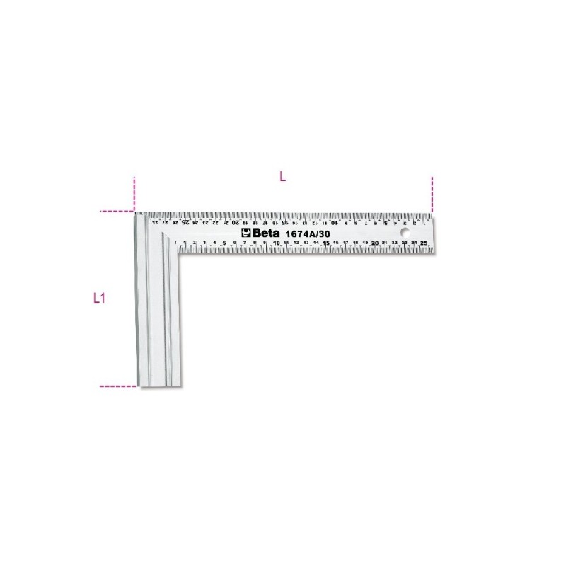 Squadra per falegname professionale Beta con lama graduata in acciaio inossidabile e base larga in alluminio pressofuso per appoggio stabile e tracciatura precisa di angoli a 90°. La graduazione incisa sulla lama consente misurazioni rapide senza necessità di metro aggiuntivo. Base con battuta di riferimento per posizionamento rapido sul bordo del pezzo da lavorare.