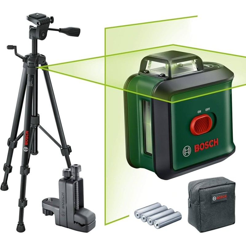 Livella laser multifunzione Bosch UniversalLevel 360 con raggio laser verde, progettata per allineamenti precisi in interni e perfetta per installazioni di guide, ripiani, piastrelle, prese e controsoffitti. Proietta una linea orizzontale a 360° e una linea verticale a 120° con alta visibilità anche in condizioni di forte luce grazie al laser verde. Include treppiede con attacco standard per montaggio stabile e regolabile.