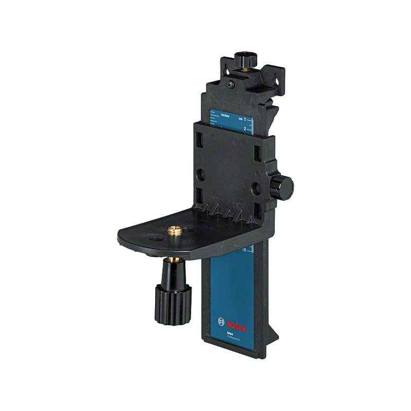 Supporto da parete professionale Bosch progettato per il fissaggio stabile e preciso di laser a linee e laser rotanti. Ideale per lavori di allineamento in cantiere e in ambienti interni, consente una regolazione micrometrica dell’altezza per un posizionamento accurato dello strumento.