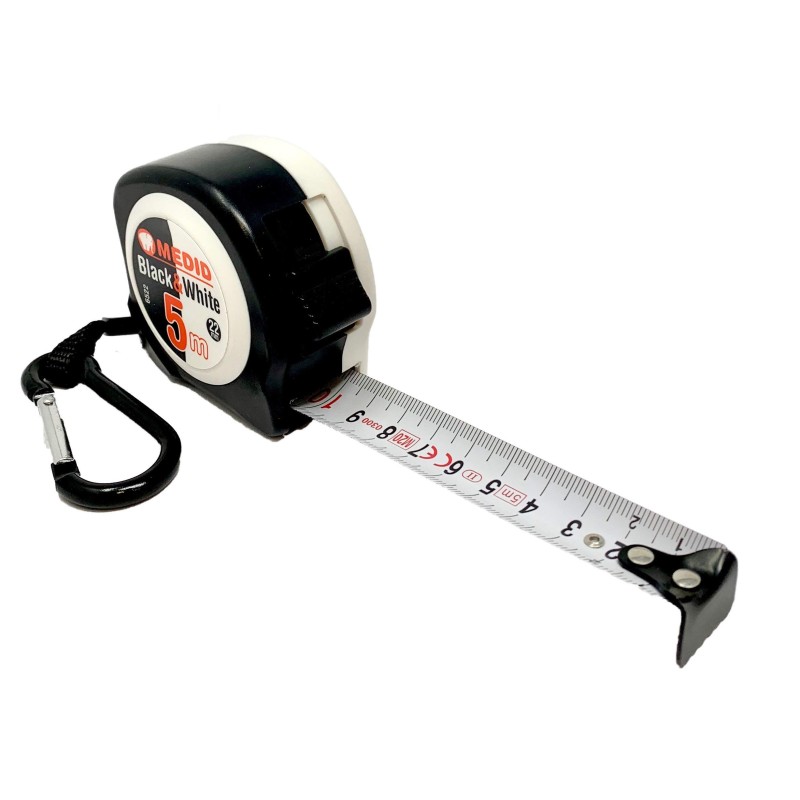 Il flessometro Medid Black & White è uno strumento di misura compatto e leggero con custodia in ABS bi‑colore bianco/nero, nastro con graduazione metrica su entrambi i lati e clip da cintura per facile trasporto, ideale per misurazioni giornaliere in cantiere, fai‑da‑te e lavori professionali.