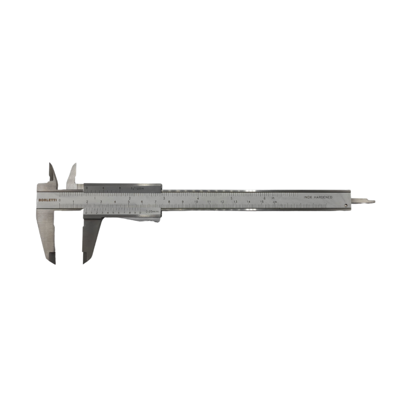 Il calibro Borletti modello CNR 150 mm è uno strumento di misura manuale professionale con asta graduata e corsoio in acciaio inox temprato, scala cromata opaca con fotoincisioni nitide, bloccaggio del nonio inferiore a leva e tabella delle filettature Metriche e Whitworth sul retro, progettato per misurazioni accurate di diametri esterni, interni e profondità secondo norme DIN 862 – UNI 3599.