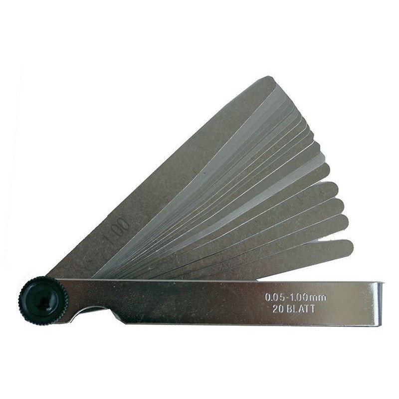 spessimetro Metrica cod. 35103 con 20 lame da 100 mm e range di spessore da 0,05 mm a 2 mm per misurazioni di giochi e tolleranze su componenti meccanici.
