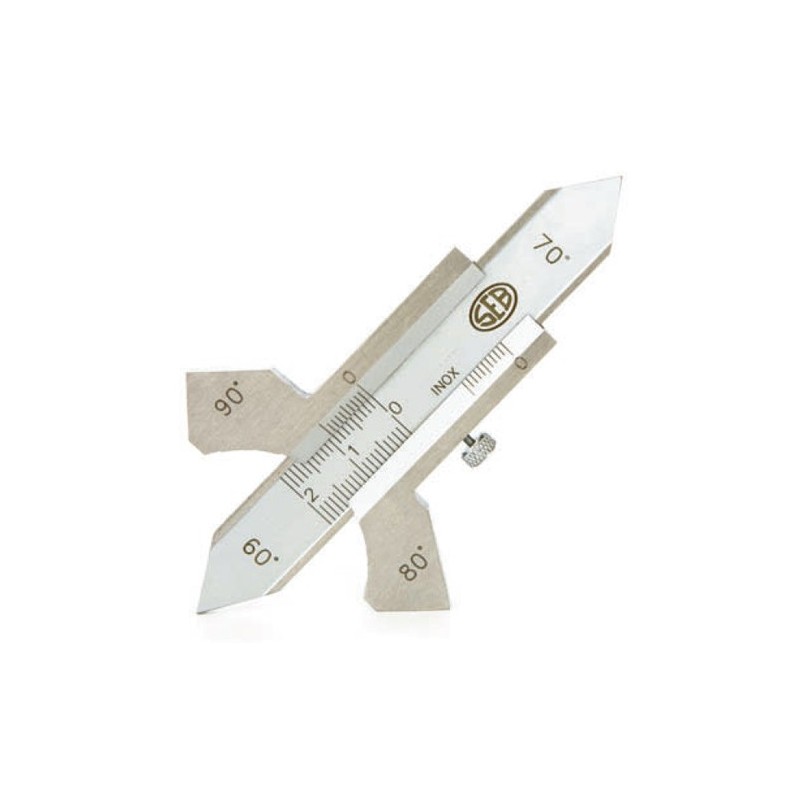 Calibro per saldature Art. 1422 in acciaio inox con scala cromata opaca per misurare spessore e geometria di cordoni di saldatura e rilevare angoli standard di giunzione.