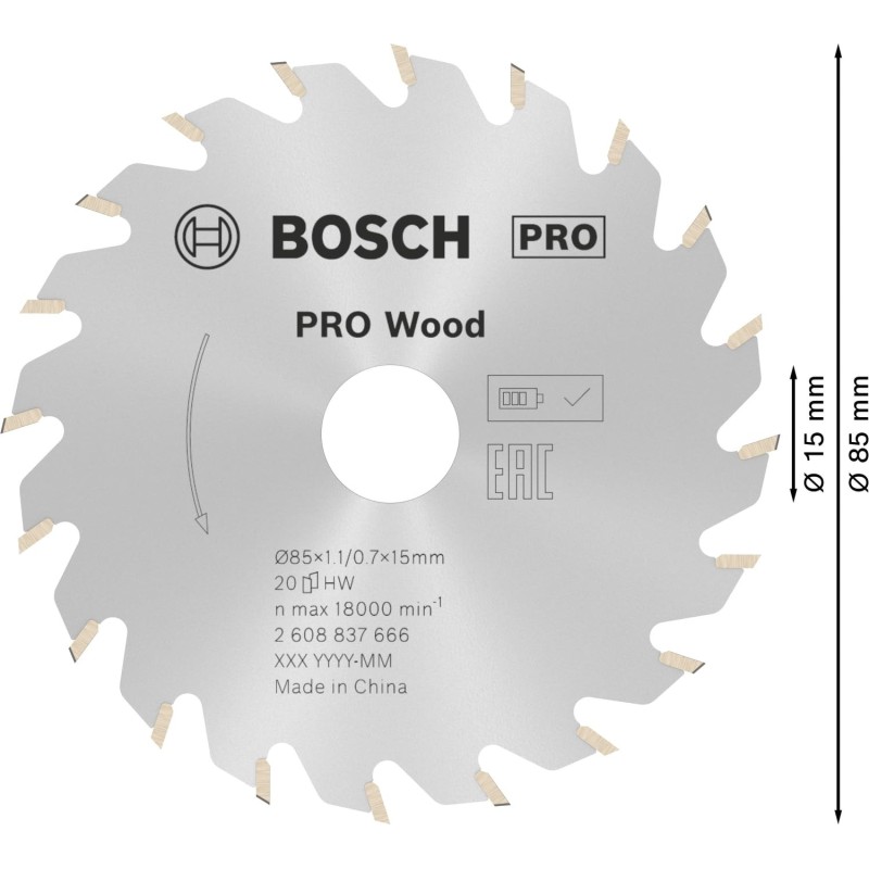 Disco standard Bosch Optiline 2608643071 Ø 85 mm con foratura Ø 15 mm, 20 denti in metallo duro (TCT) e profilo ATB per tagli netti e precisi nel legno e materiali a base di legno.