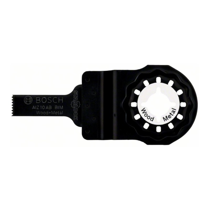 Lama multifunzione Bosch AIZ 10 AB 2608661641 con materiale BIM che combina corpo in High Carbon Steel (HCS) e denti in High Speed Steel (HSS) per resistenza a usura e calore, progettata per tagli di precisione a filo e tagli a tuffo in legno, metallo non temprato e plastiche; la stretta larghezza di 10 mm permette interventi filigranati, mentre l’attacco Starlock Snap‑In garantisce ottimale trasferimento di potenza, stabilità ridotta di oscillazioni e cambio rapido della lama in pochi secondi.