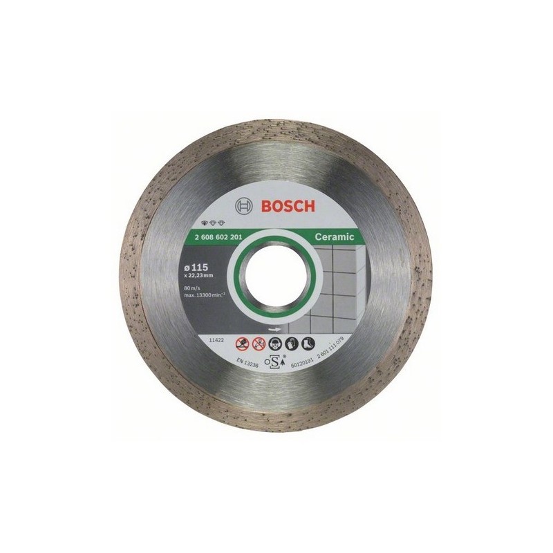 Disco diamantato Bosch specifico per ceramica, diametro 115 mm. Corona continua (bordo liscio) per un taglio netto, preciso e privo di sbeccature su piastrelle, ceramica e gres.
