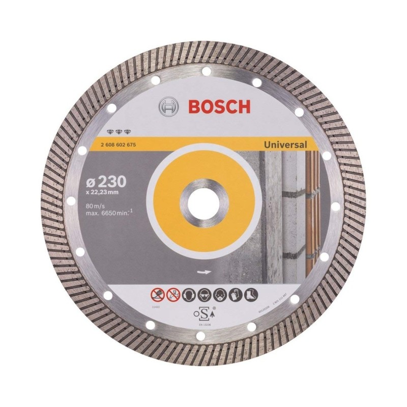 Disco diamantato Bosch con corona continua turbo, diametro 230 mm. La corona turbo ondulata combina velocita di taglio e finitura discreta, offrendo un compromesso tra i dischi segmentati (veloci ma con taglio grezzo) e quelli a corona continua (lenti ma con taglio netto).