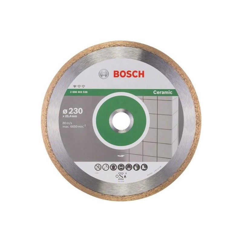 Disco diamantato Bosch specifico per ceramica, diametro 230 mm. Corona continua per taglio netto e preciso su piastrelle di grande formato e gres porcellanato.