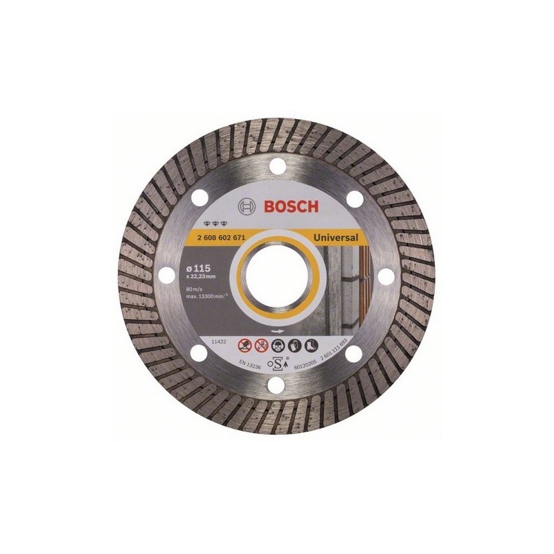 Disco diamantato Bosch con corona turbo, diametro 115 mm. La corona ondulata offre un buon compromesso tra velocita di taglio e finitura per uso universale.