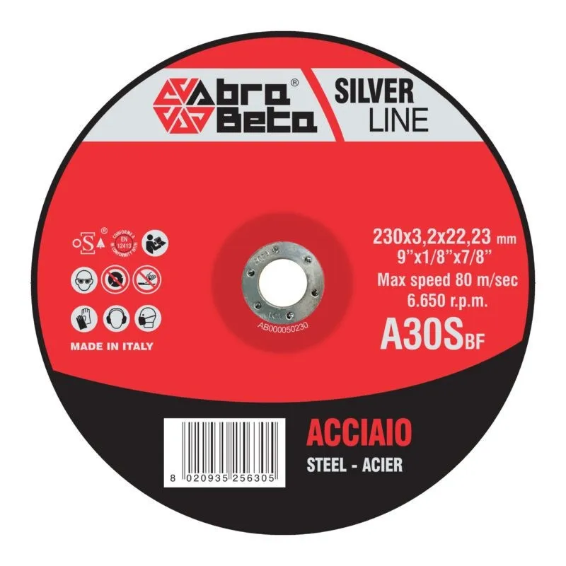Disco rigido da taglio Abra Beta linea Silver, ad alte prestazioni. Geometria del disco: centro piano. Utilizzabile per il taglio di acciaio. La linea Silver garantisce un eccellente compromesso tra prezzo e qualità, con un'ampia varietà di prodotti che la rende particolarmente versatile ed adatta a tutte le lavorazioni che richiedono alte prestazioni. Precisa e concentrata asportazione di materiale con basso assorbimento di potenza dell'elettroutensile. Ridotta produzione di bave da taglio.
