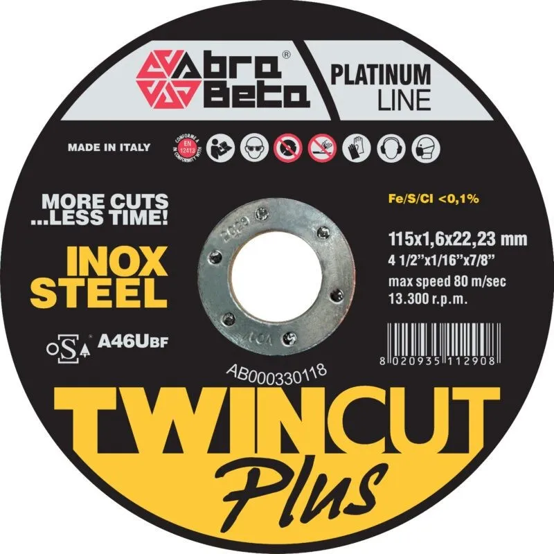 Disco rigido da taglio Abra Beta linea Platinum, ad elevatissime prestazioni. Geometria del disco: centro piano. Utilizzabile universalmente per il taglio di acciai inossidabili, acciai legati, acciaio. Elevata asportazione di materiale unita ad un basso consumo del disco. La linea Platinum rappresenta il top di gamma per professionisti esigenti.