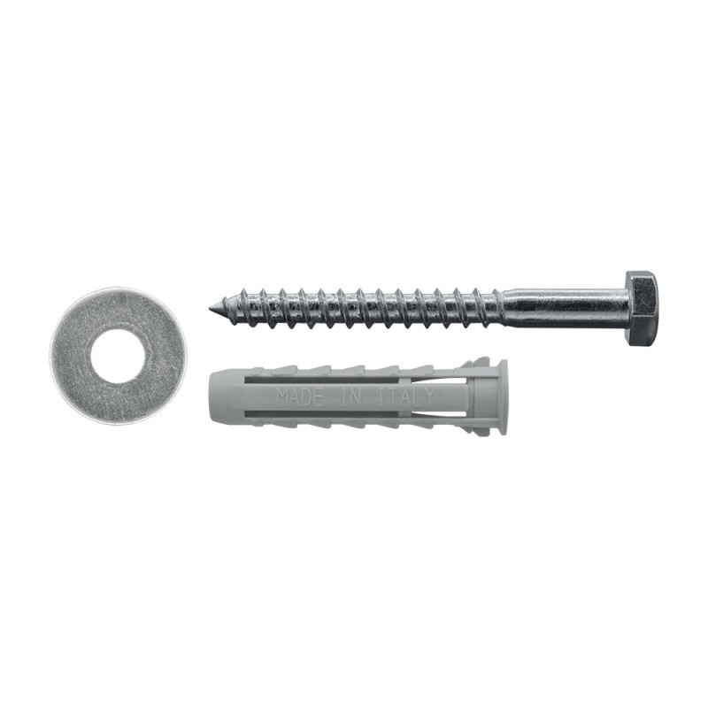 Tassello con tirafondo per fissaggio di elementi in legno e carpenteria leggera su muratura e calcestruzzo. Il tirafondo (vite testa esagonale) consente il serraggio con chiave o bussola per un fissaggio sicuro e regolabile.