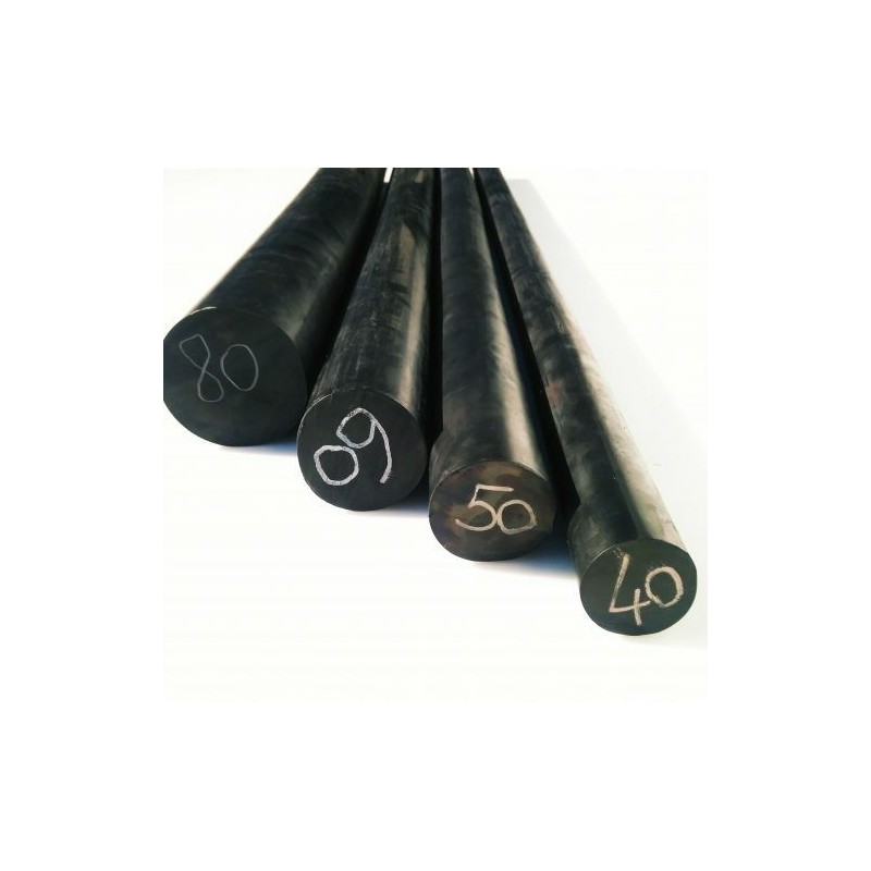 Barra tonda in gomma tornibile nera durezza 70 Shore. Venduta a metro o a peso. 8 diametri da 20 a 100mm.