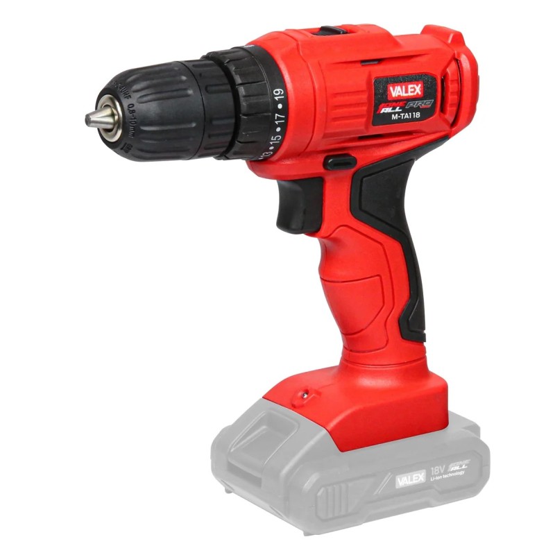 Trapano avvitatore con alimentazione a batteria al litio M-TA1 18 della serie OneAll di Valex. Batteria e caricabatterie non inclusi.