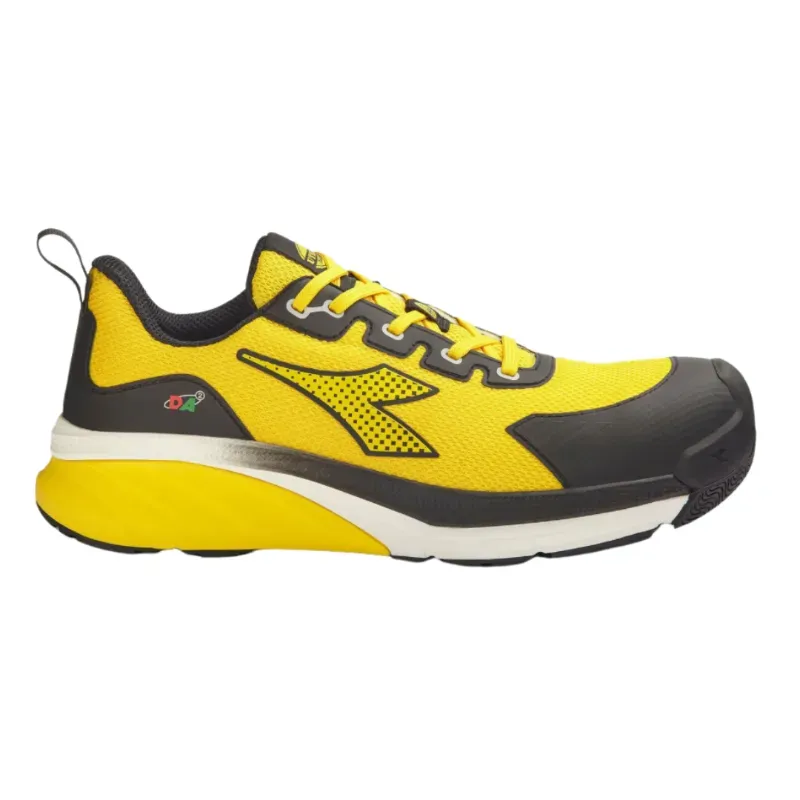 Scarpa antinfortunistica bassa Diadora Utility Vortex DA2 Low S1PS SC SR HRO ESD colore Giallo Utility/Giallo Utility. Tomaia in tessuto tecnico poliestere con rinforzi 3D print, puntale alluminio 200J, lamina K-Sole, suola con tecnologia di ammortizzazione DA2 Vortex, battistrada gomma nitrilica HRO SR. Conforme EN ISO 20345:2022.