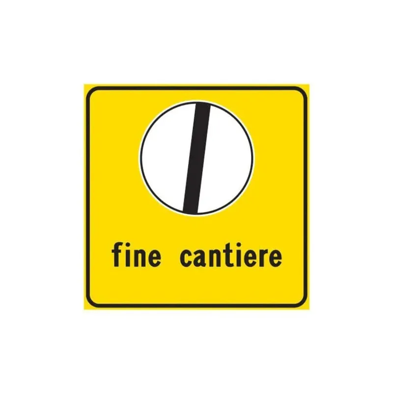 Cartello di segnaletica da cantiere formato rettangolare 60x60 cm con indicazione "Fine Cantiere". Conforme alla normativa sulla sicurezza nei cantieri (D.Lgs. 81/08). Resistente agli agenti atmosferici, idoneo per installazione in aree esterne a delimitazione del termine dell'area di cantiere.