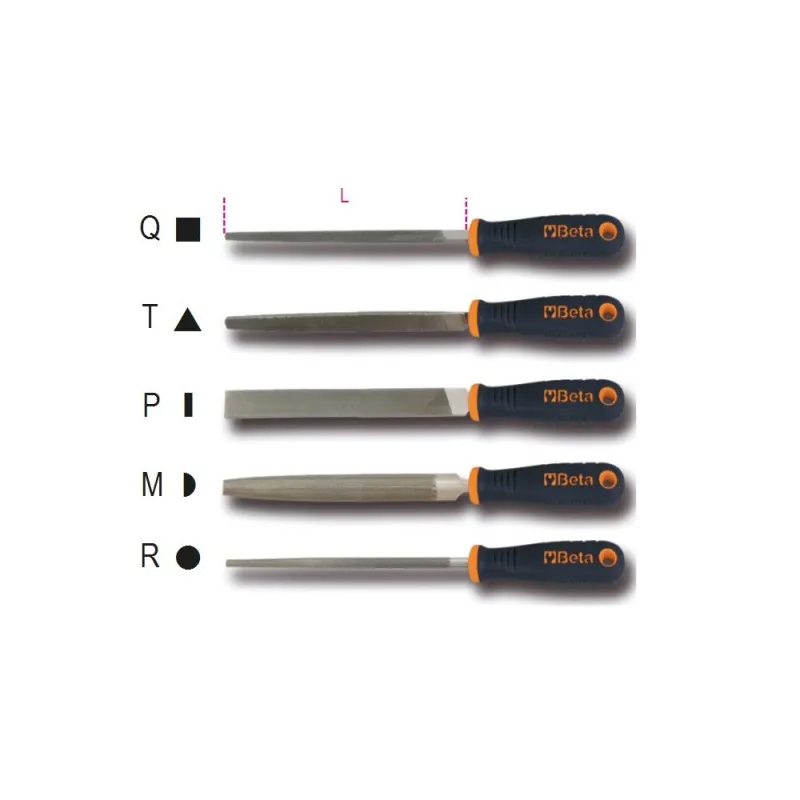 Lima professionale Beta per la finitura, la sbavatura e l'aggiustaggio di superfici metalliche, plastiche e in legno. Dentatura di precisione in acciaio al carbonio temprato per asportazione uniforme del materiale. Manico bimateriale ergonomico con guardia di protezione.