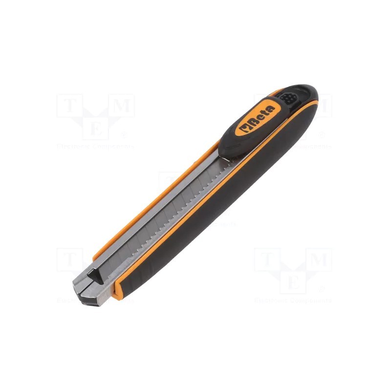 Coltello professionale Beta per uso in officina, cantiere e manutenzione. Lama in acciaio inossidabile temperato con filo di lunga durata. Impugnatura ergonomica in materiale antiscivolo con clip di aggancio alla cintura. Meccanismo di apertura e chiusura sicuro con blocco lama.