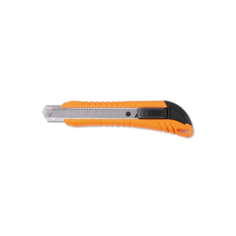 Coltello professionale Beta per uso in officina, cantiere e manutenzione. Lama in acciaio inossidabile temperato con filo di lunga durata. Impugnatura ergonomica in materiale antiscivolo con clip di aggancio alla cintura. Meccanismo di apertura e chiusura sicuro con blocco lama.