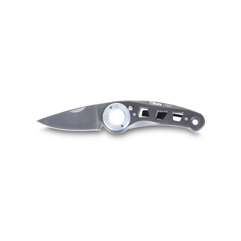 Coltello professionale Beta per uso in officina, cantiere e manutenzione. Lama in acciaio inossidabile temperato con filo di lunga durata. Impugnatura ergonomica in materiale antiscivolo con clip di aggancio alla cintura. Meccanismo di apertura e chiusura sicuro con blocco lama.