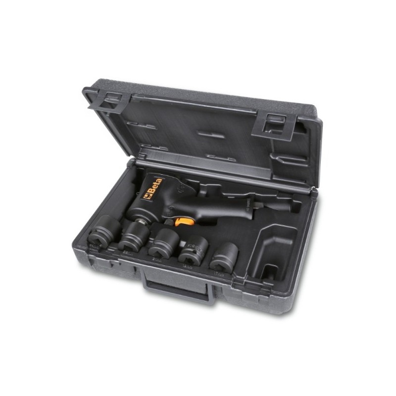 Utensile pneumatico professionale Beta alimentato ad aria compressa per uso intensivo in officina e industria. Corpo in lega leggera con motore a palette ad alta efficienza per elevata potenza con peso ridotto. Regolazione della velocità tramite grilletto progressivo. Bassa vibrazione e rumorosità per comfort dell'operatore.