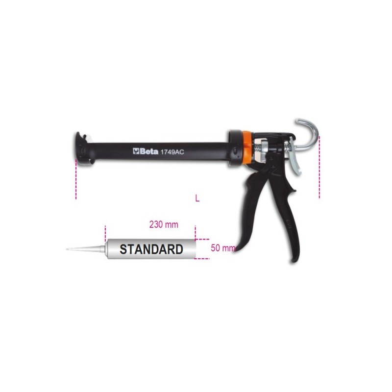 Pistola per sigillanti e silicone professionale Beta per l'applicazione di cartucce di sigillante, silicone e ancoranti chimici. Meccanismo a cremagliera con rapporto di spinta elevato per estrusione uniforme anche con sigillanti ad alta viscosità. Corpo in lamiera stampata o lega leggera.