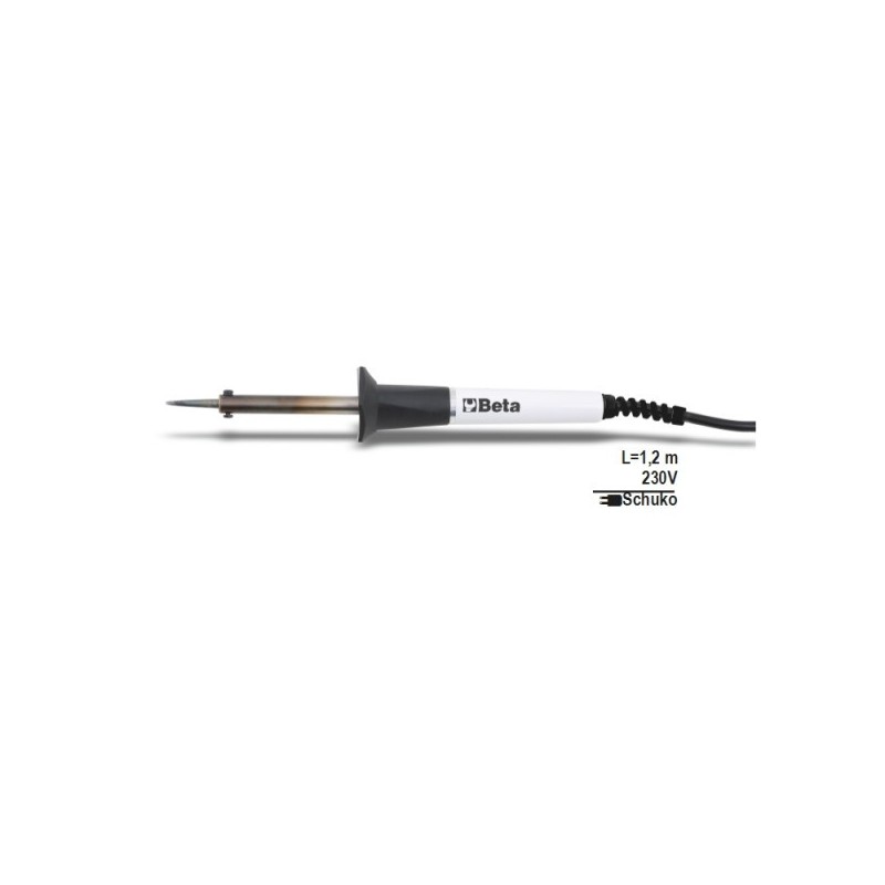 Saldatore elettrico professionale Beta con punta in rame elettrolitico per saldature a stagno su componenti elettrici, elettronici e piccola carpenteria. Elemento riscaldante ad alta efficienza per raggiungimento rapido della temperatura di lavoro. Impugnatura termoisolante con protezione antiscottatura.