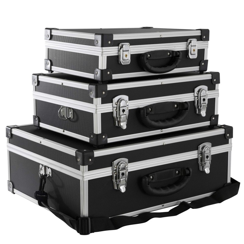 Set di tre valigie in alluminio con angoli rinforzati in ABS e tracolla per il trasporto marca Ferval. Le tre misure crescenti coprono diverse esigenze di capienza, dall'attrezzatura leggera agli utensili di grandi dimensioni. L'alluminio garantisce leggerezza e robustezza, gli angoli in ABS proteggono dagli urti.
