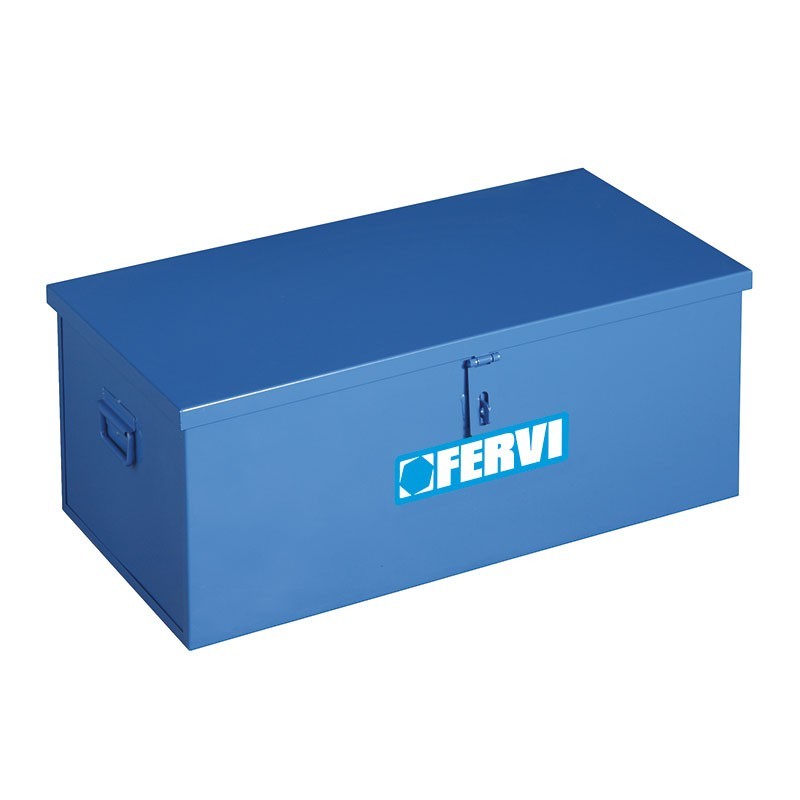 Baule in acciaio marca Fervi articolo 0363/30. Contenitore robusto in lamiera d'acciaio stampata e verniciata, con coperchio incernierato e chiusura. Ideale per lo stoccaggio e il trasporto di attrezzature pesanti, utensili e materiali di cantiere.
