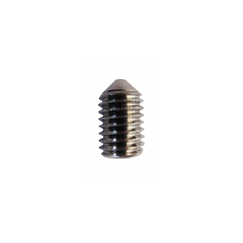 Grani (viti senza testa) a punta conica con cava esagonale interna in acciaio inox AISI 304. Si avvitano all'interno di fori filettati per bloccare un componente su un albero o un asse tramite la pressione della punta sul pezzo.